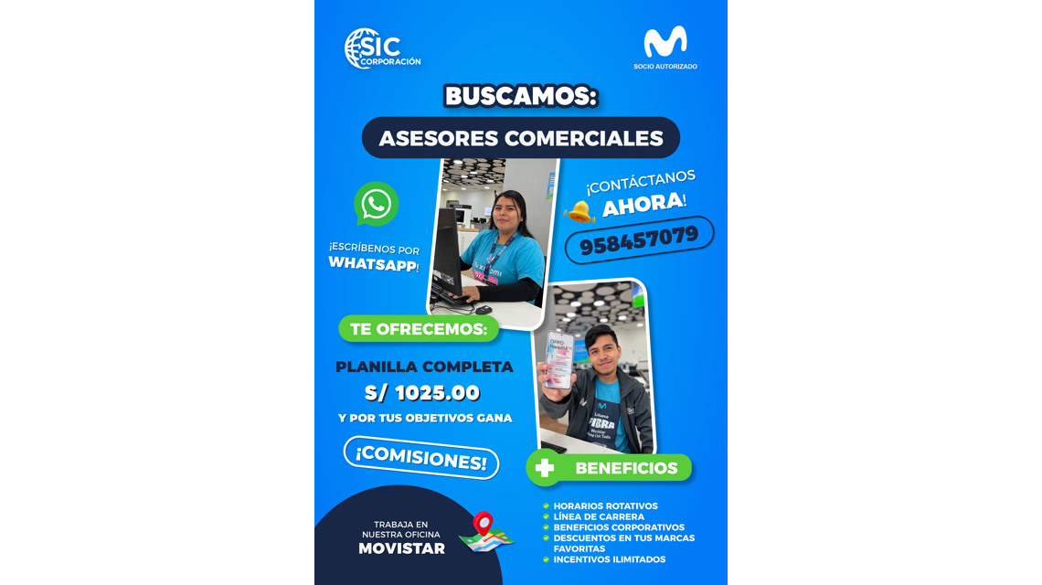 En Corporación SIC, socio estratégico de Movistar, estamos en búsqueda de personas apasionadas por el servicio al cliente y las ventas para ser parte de nuestro equipo en la tienda de Movistar Huancayo. Si eres proactivo/a, motivando/a y estás listo/a para desarrollarte en el emocionante mundo de las telecomunicaciones, ¡esta es tu oportunidad!